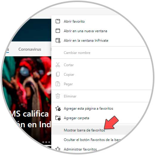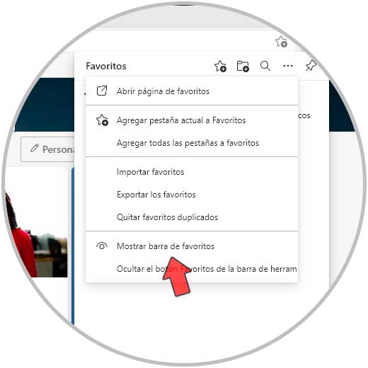 Damos clic en "Mostrar barra de favoritos" y seleccionamos la opción que necesitemos: