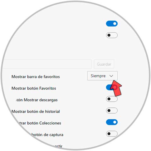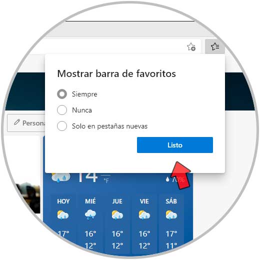 Allí damos clic en "Mostrar barra de favoritos" y seleccionamos la opción adecuada. Aplicamos los cambios dando clic en Listo.