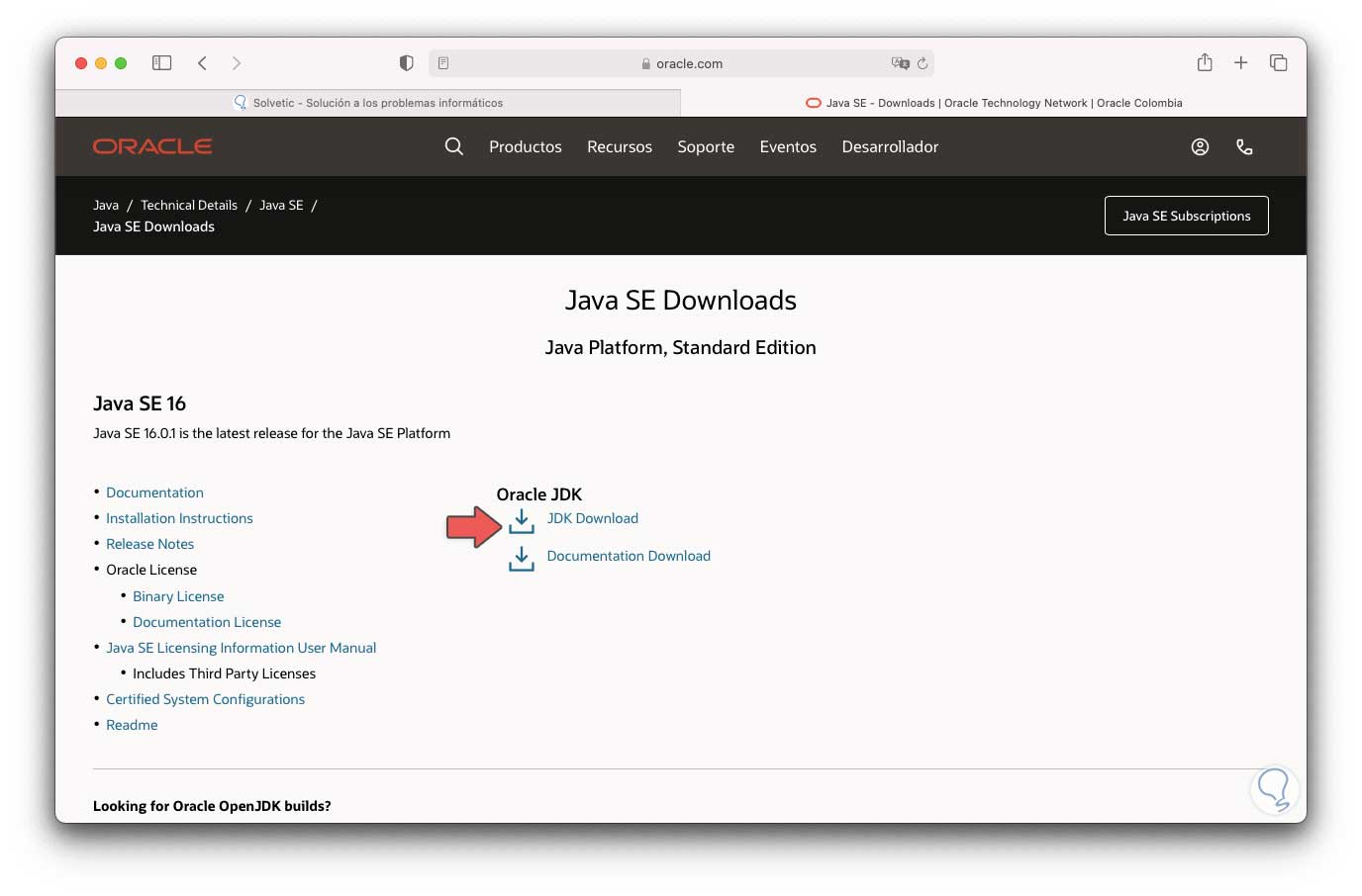 Damos clic en JDK Download y en la siguiente ventana descargamos la versión para macOS: