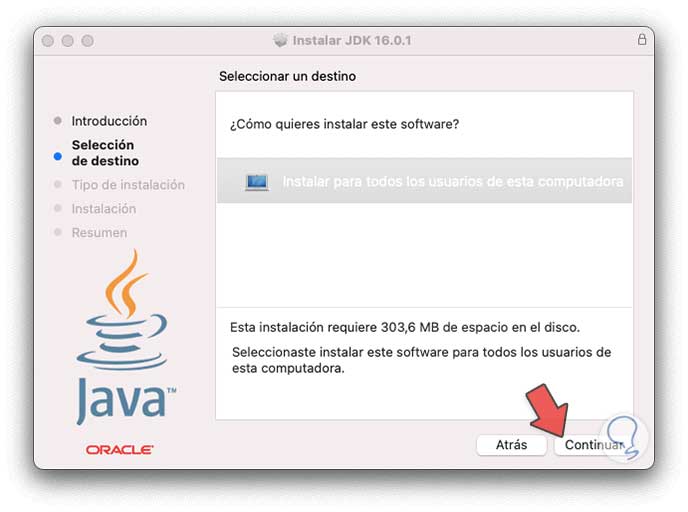 Damos clic en Continuar y definimos si deseamos instalar Java para todos los usuarios del sistema: