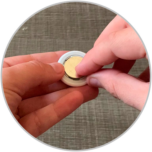 Ahora, pon la tapa encima y presiona mientras giras ligeramente hacia la derecha para cerrar. Al hacer contacto la nueva pila, el AirTag hará un sonido.