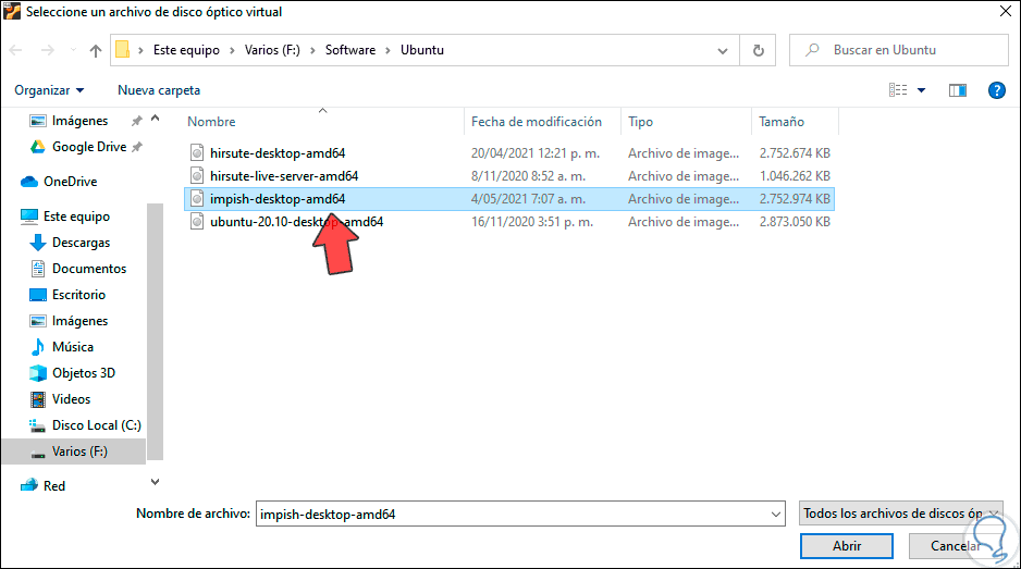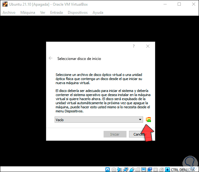 Damos clic en el icono de examinar para seleccionar la imagen ISO de Ubuntu 21.10 que hemos descargado: