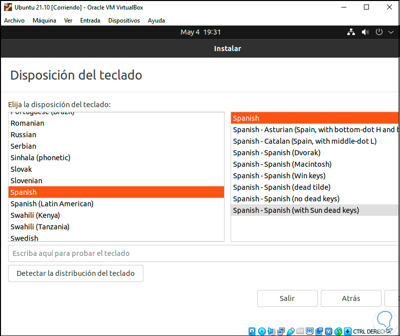 Damos clic en "Instalar Ubuntu" y después de esto seleccionamos el idioma del teclado: