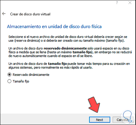Damos clic en Next y establecemos el tamaño del disco, así como su ubicación si es necesario:
