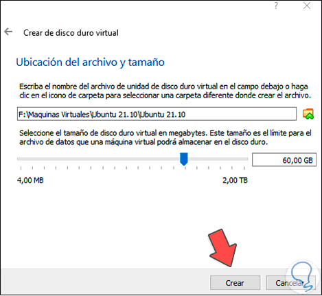 En la siguiente ventana vamos a crear el disco duro virtual para Ubuntu 21.10:
