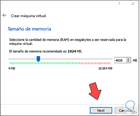 Damos clic en Next para establecer la memoria RAM a usar en la máquina virtual: