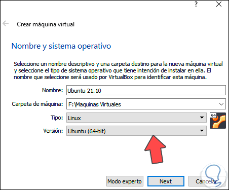 En la ventana emergente, ingresamos el nombre, tipo y versión del sistema operativo a usar, en este caso Ubuntu: