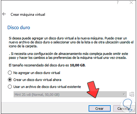 Damos clic en Crear y seleccionamos el tipo de disco a usar: