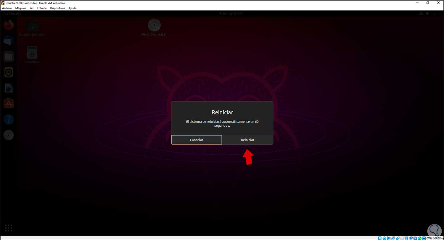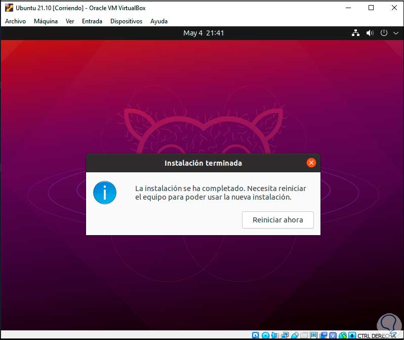Al finalizar la instalación será necesario reiniciar la máquina virtual: