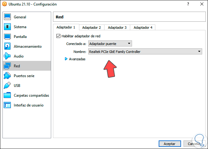Accedemos a la configuración de la máquina virtual y allí, en la sección Red activamos el adaptador de red del equipo físico. Aplicamos los cambios.