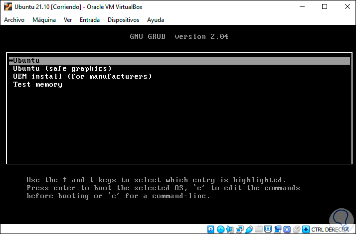 Damos clic en “Iniciar” para ver el menú de arranque de Ubuntu 21.10: