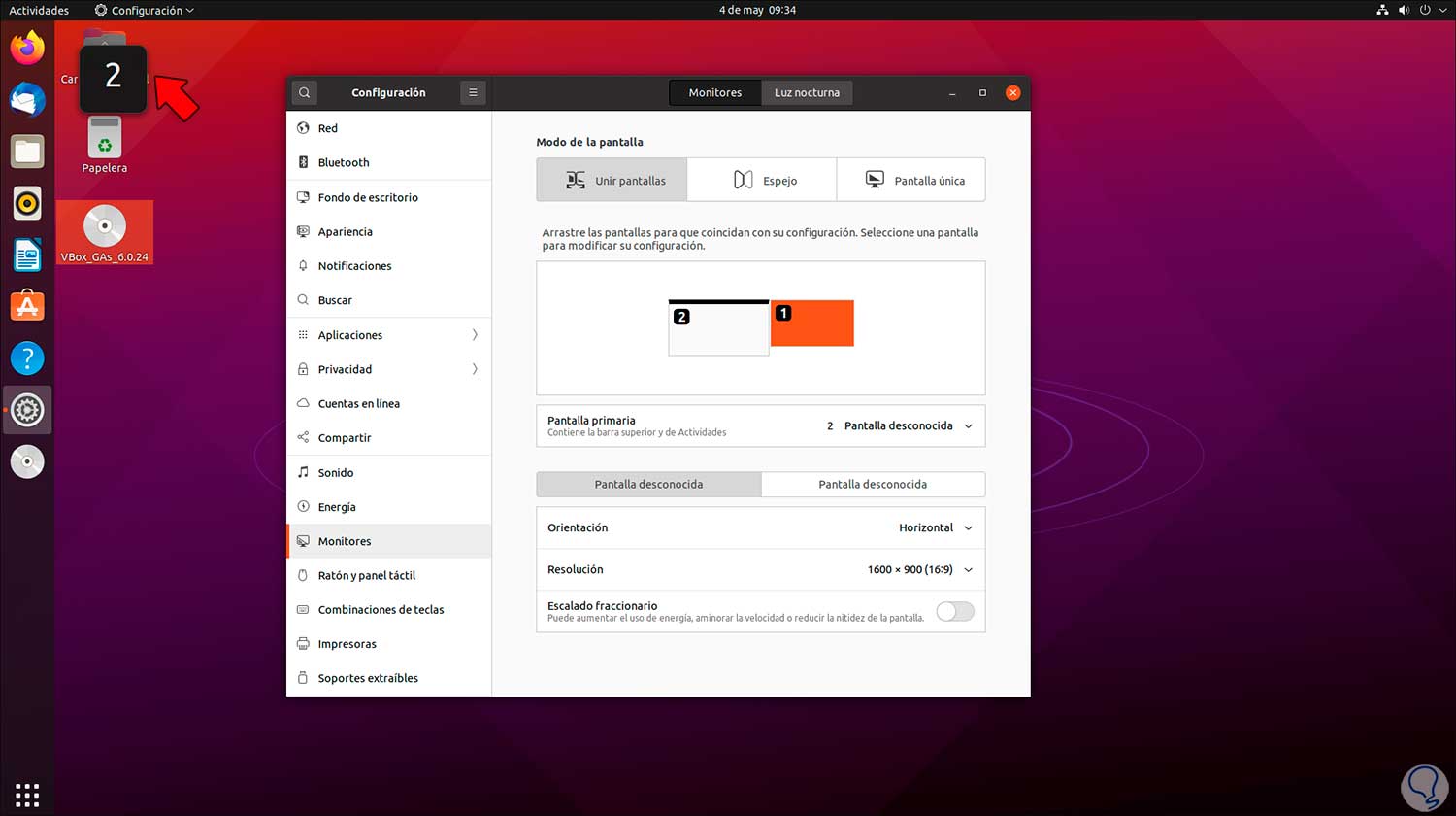 Observemos que de forma automática Ubuntu 21.04 detecta en cual monitor estamos trabajando en ese momento: