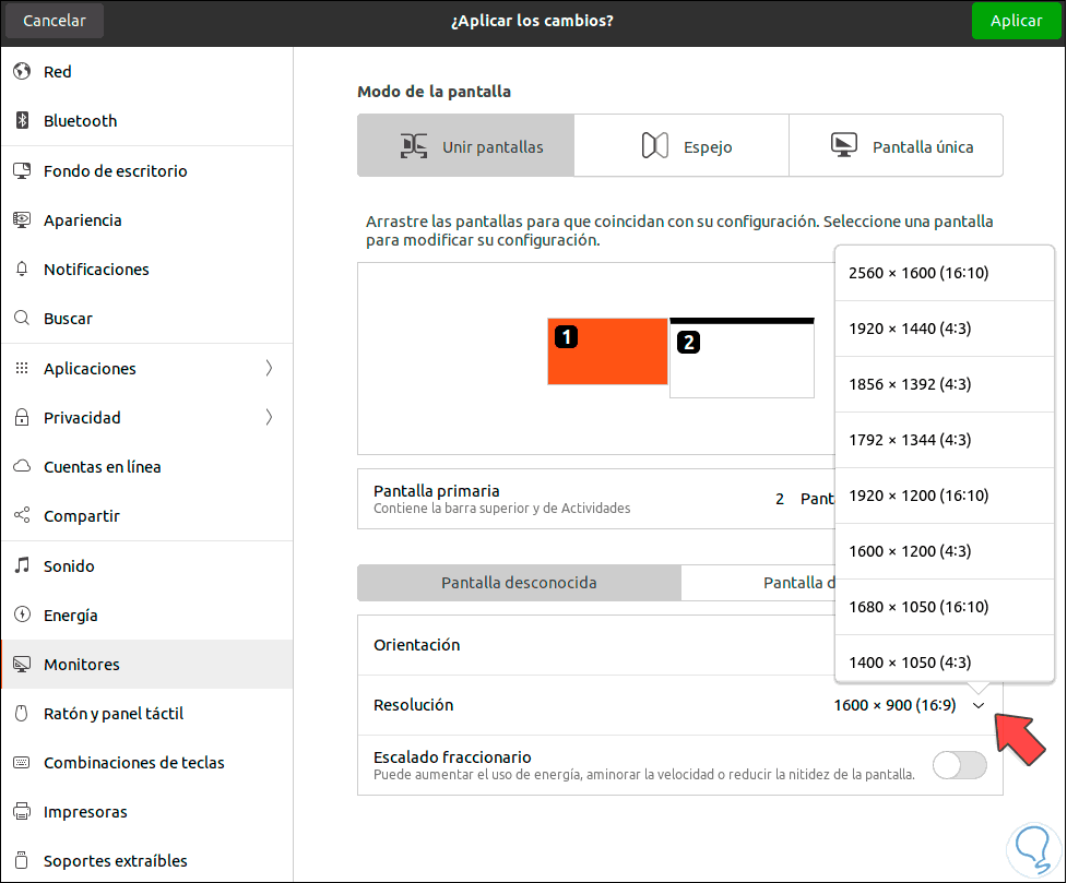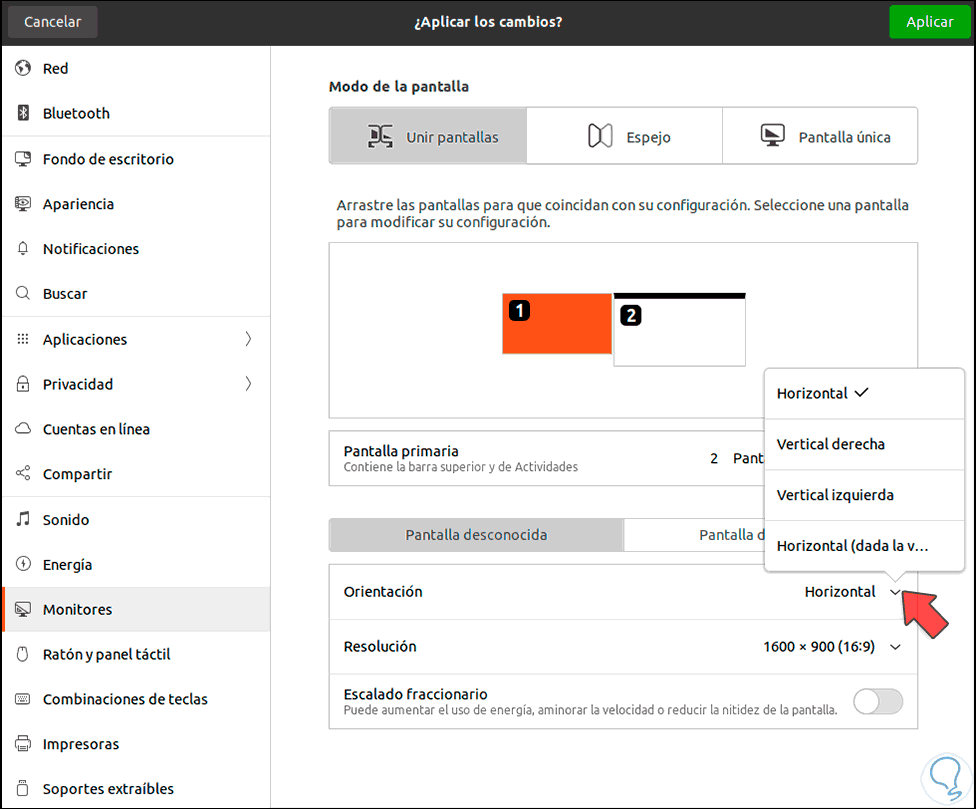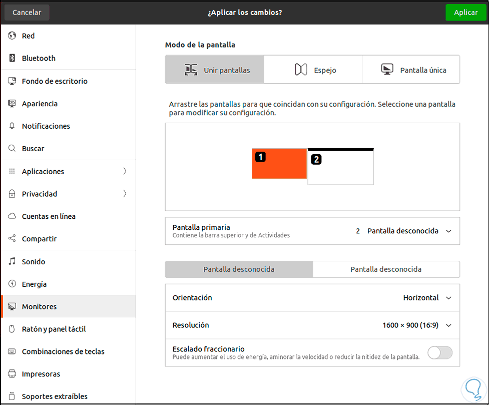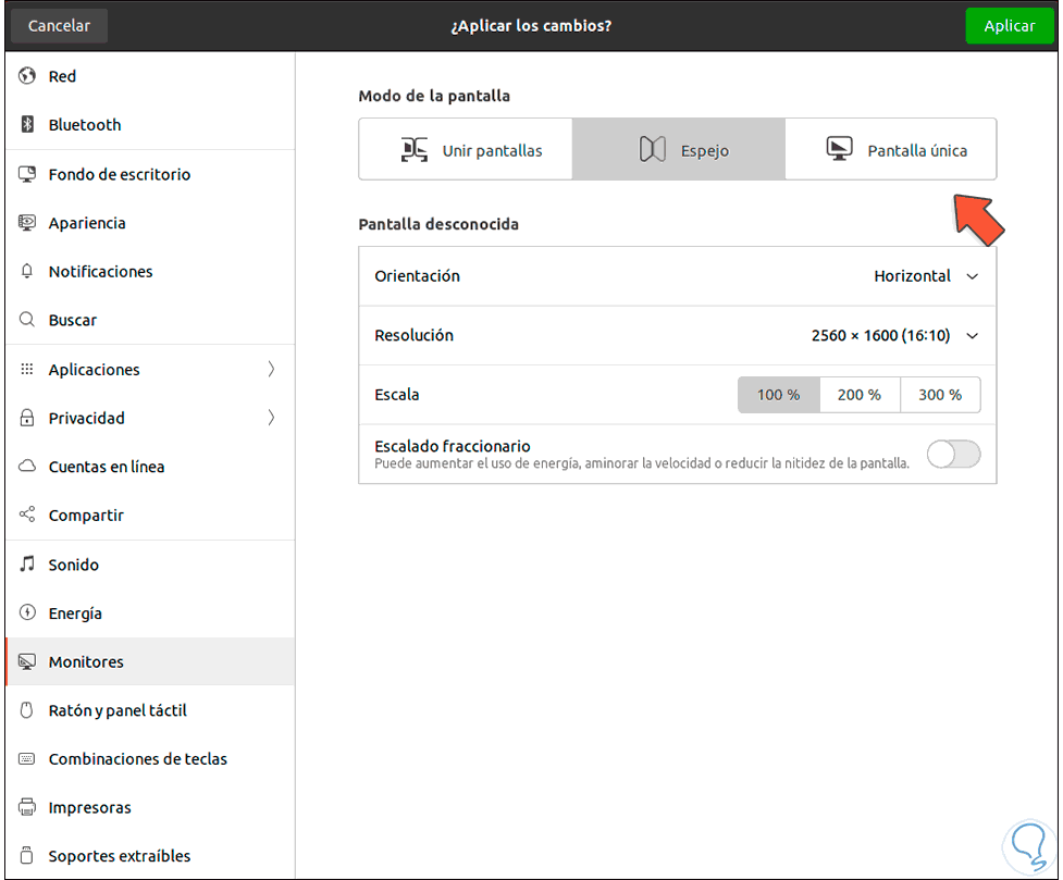 O la resolución del monitor. Para duplicar la pantalla en Ubuntu 21.04, vamos a la sección "Espejo". Allí disponemos de las mismas opciones de ajustes para la orientación, resolución o el porcentaje de escalamiento de la pantalla. Damos clic en Aplicar para completar el proceso.