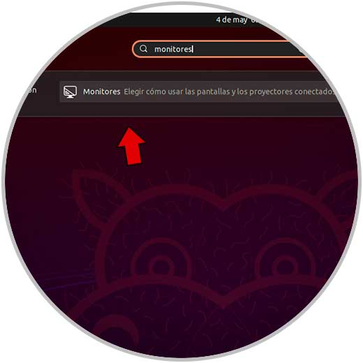 Para ello abrimos Ubuntu 21.04, vamos a Actividades y allí buscamos "Monitores":