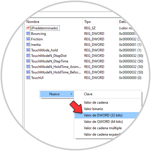 Damos clic derecho en algún lugar libre y seleccionamos la opción "Nuevo - Valor de DWORD (32 bits)":