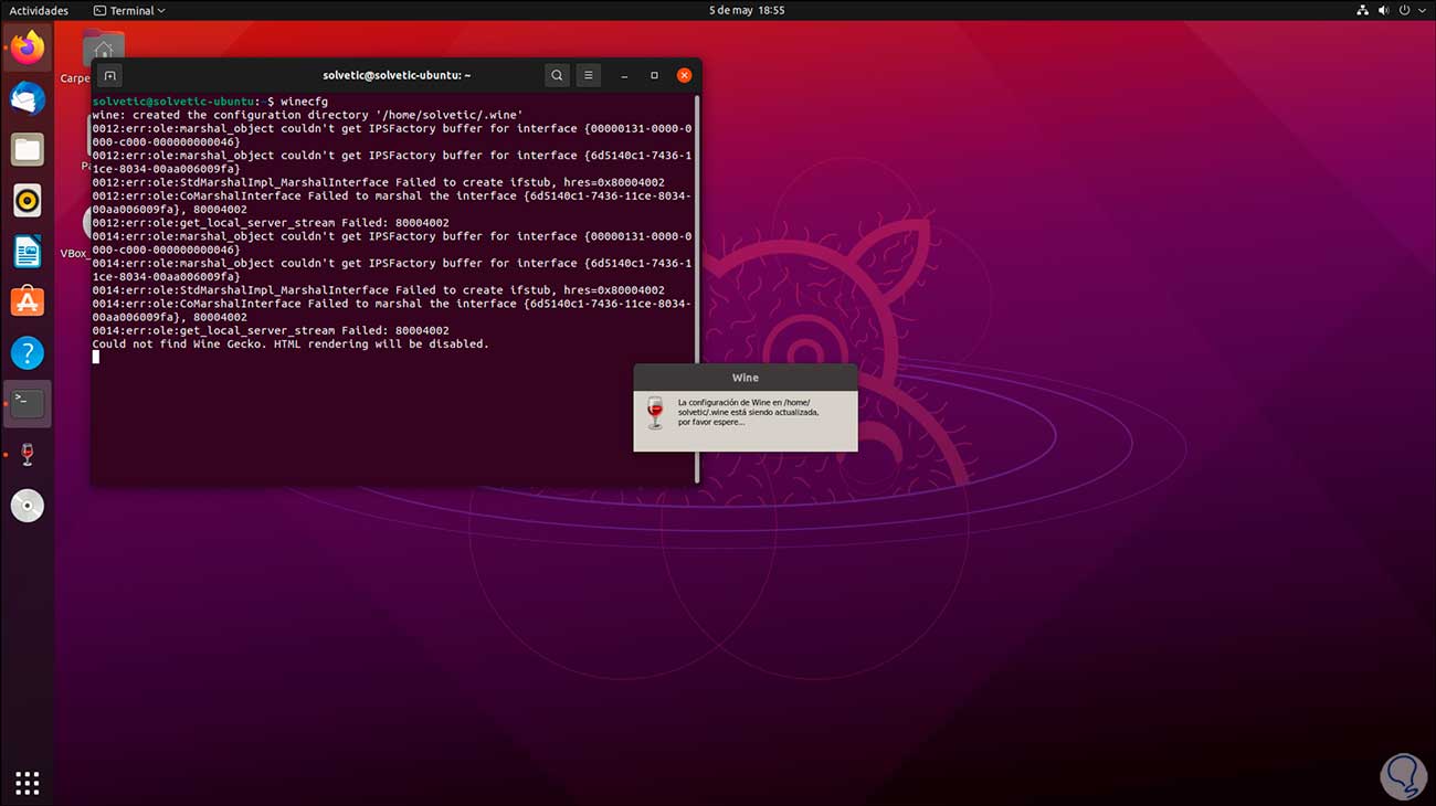 Una vez Wine este instalado, es hora de configurarlo, para ello ejecutamos el siguiente comando: