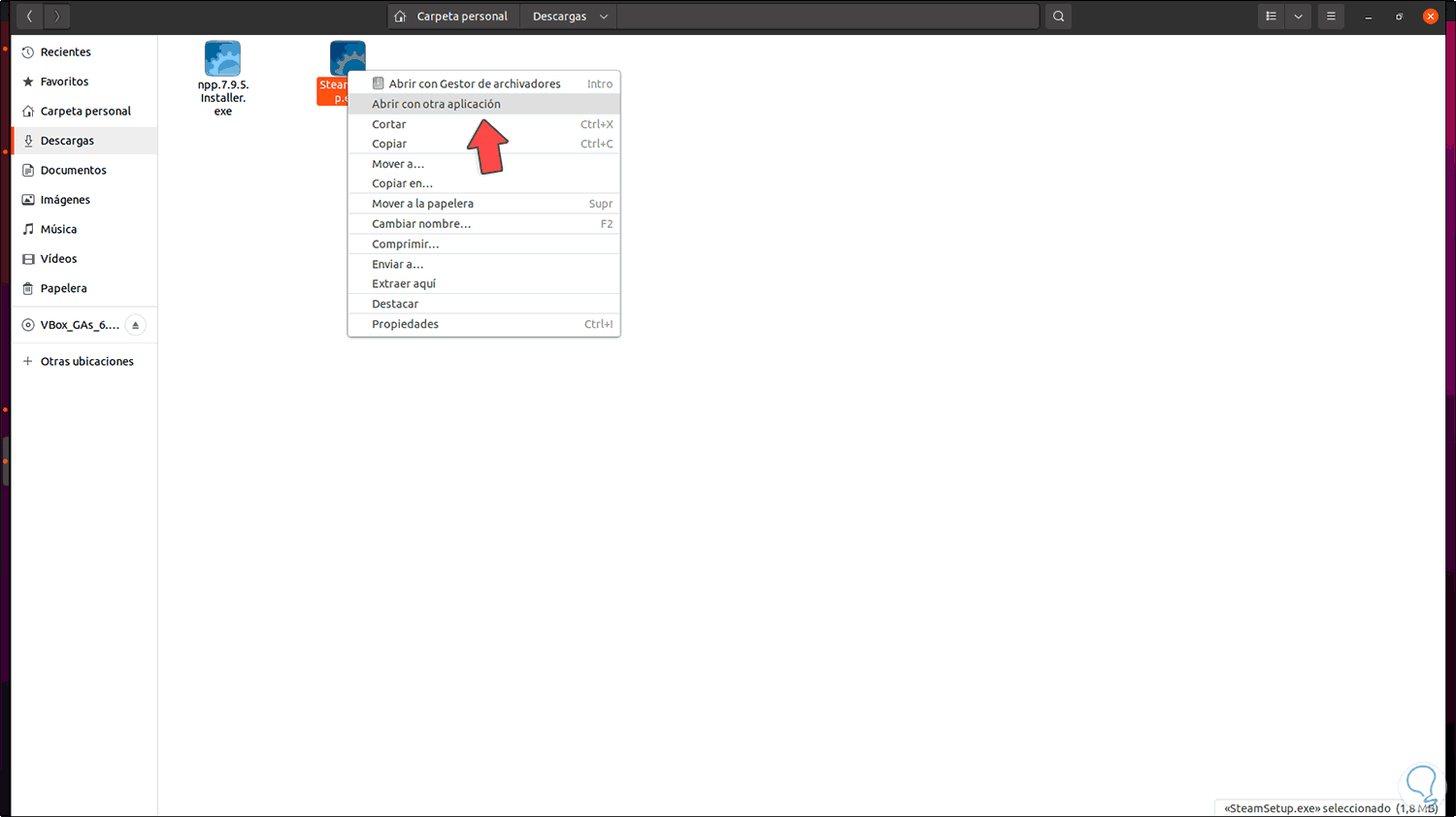 Estamos listos para usar las aplicaciones de Windows, para ello uno de los métodos es dar clic sobre el ejecutable y seleccionar "Abrir con otra aplicación".Luego buscar Wine.