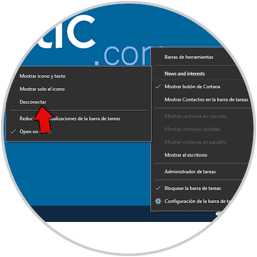 Para ocultar esta información del tiempo, damos clic derecho en la barra de tareas y en el menú desplegado vamos a la sección "News and interests" y allí damos clic en "Desconectar":
