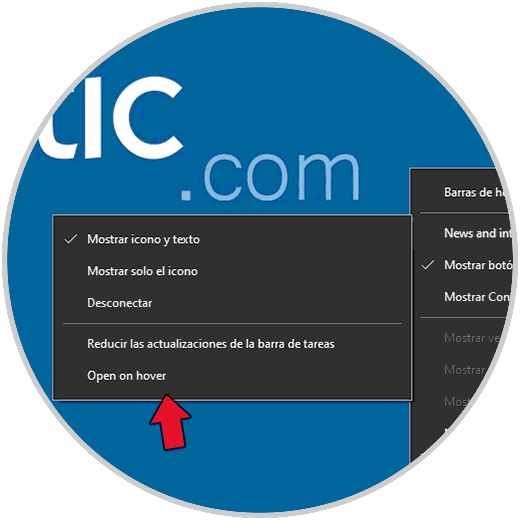 Ahora, para detener las actualizaciones de tiempo, damos clic derecho en la barra de tareas y en la sección "News and interests" damos clic en "Open on hover":