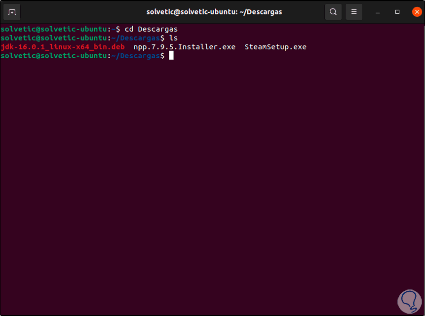 Una vez sea descargado, vamos de nuevo a la terminal y allí accedemos a la carpeta Descargas usando el comando cd y listamos el contenido con “ls” para ver la descarga de Java JDK: