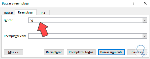 Se abrirá la ventana emergente, en ella, en el campo "Buscar" ingresamos "^g" y el campo "Reemplazar con" debe estar vacío: