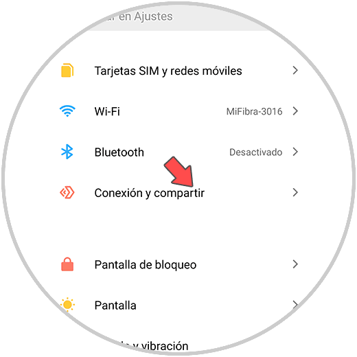 Una vez dentro del menú de ajustes, vamos a desplazarnos y entraremos en la opción de "Conexión y compartir" para revisar esta opción.
