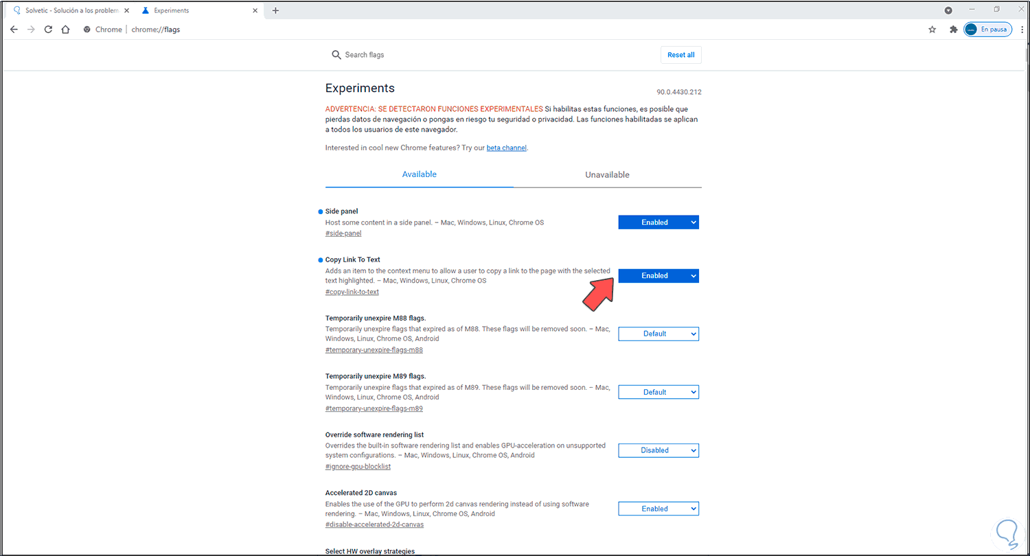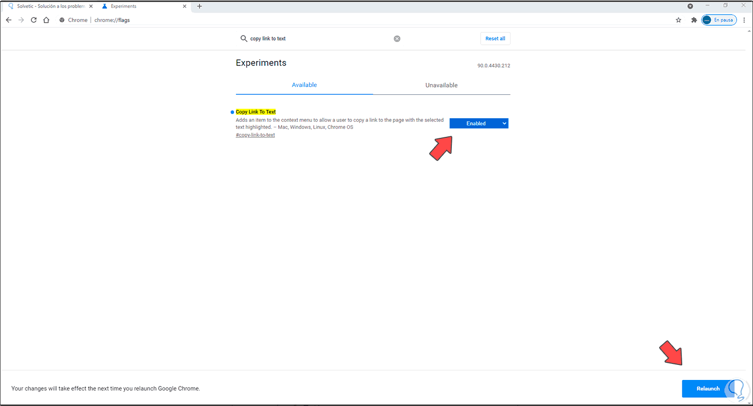 Damos clic en "Relaunch" para completar el proceso, esto hará que Google Chrome se reinicie y luego vemos que esta función esta activa (Enabled):