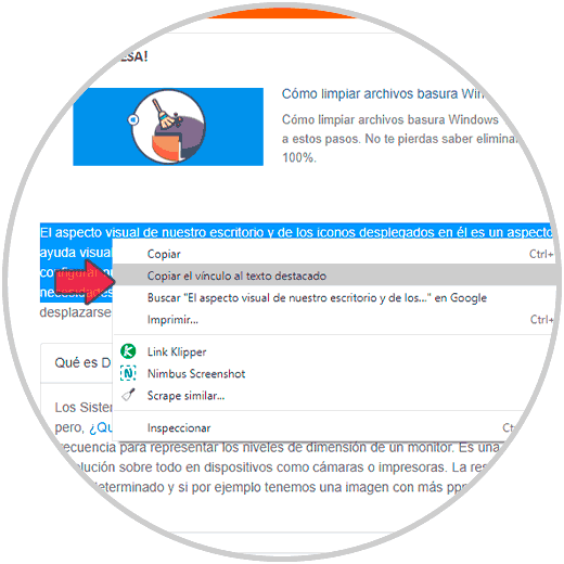 Ahora para ver su funcionamiento, seleccionamos el texto deseado, damos clic derecho sobre él y seleccionamos "Copiar el vínculo al texto deseado":