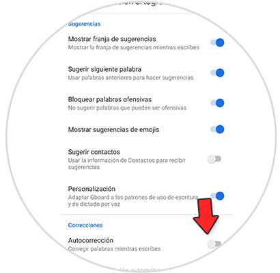 Finalmente debes dirigirte al apartado de “Correcciones” de tu teléfono móvil, y luego ir a la opción que dice “Autocorrección” para deshabilitarla.