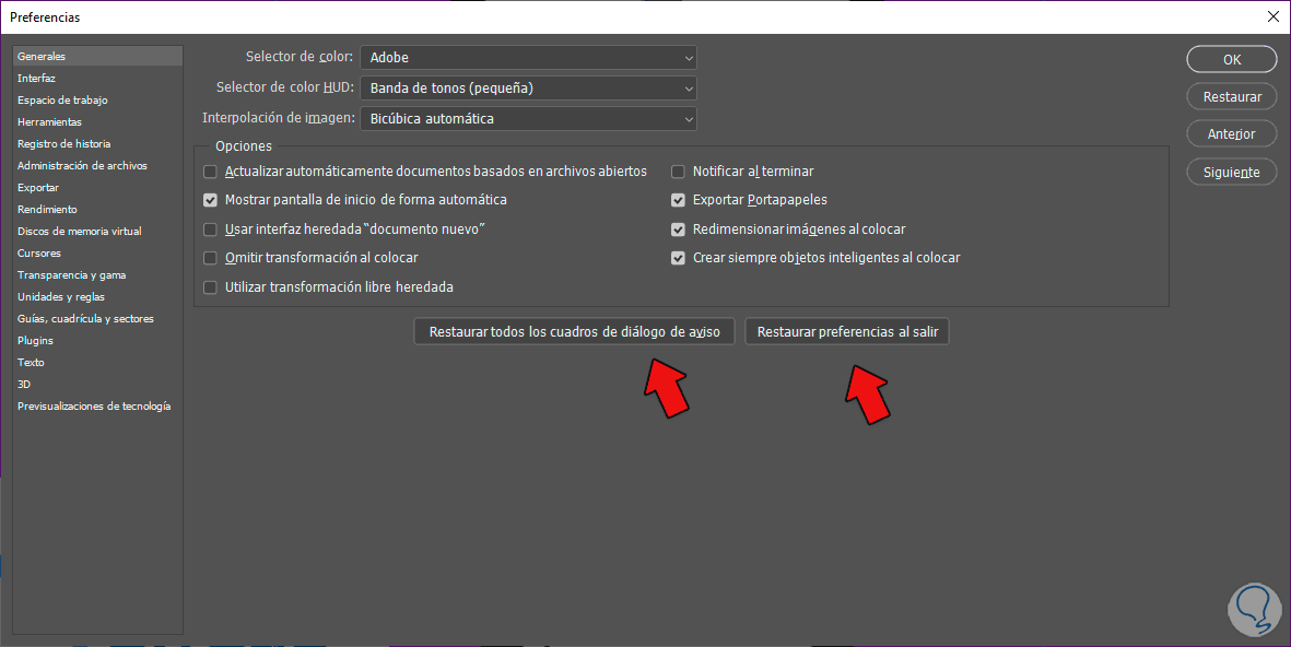 Dentro de la categoría de “General” veremos la opción de “Restaurar todos los cuadros de diálogo de aviso” y “Restaurar preferencias al salir”. Pulsa ambas opciones