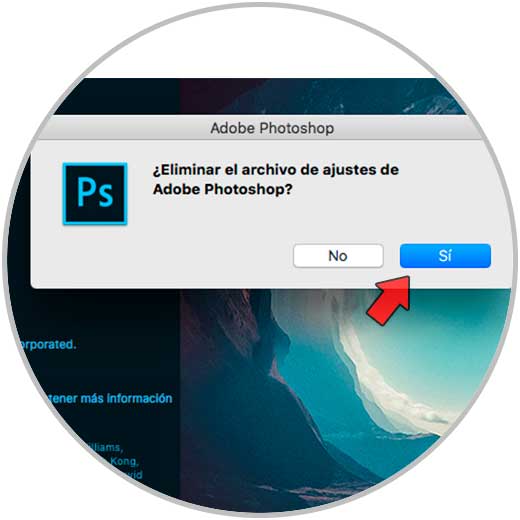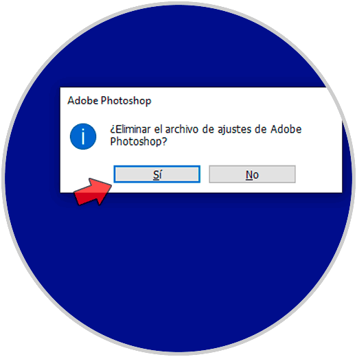 Ahora confirma la acción de borrado del archivo de ajustes de Photoshop para que al abrir esté la configuración por defecto.