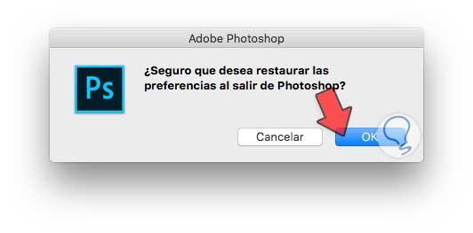 Acepta la casilla que aparece para poder resetear la configuración a por defecto en Photoshop Mac.