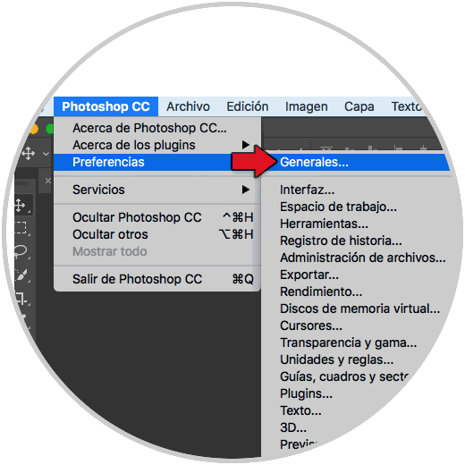 Abrimos Photoshop y pulsamos en el menú de Photoshop. Después elegiremos “Preferencias – Generales”.