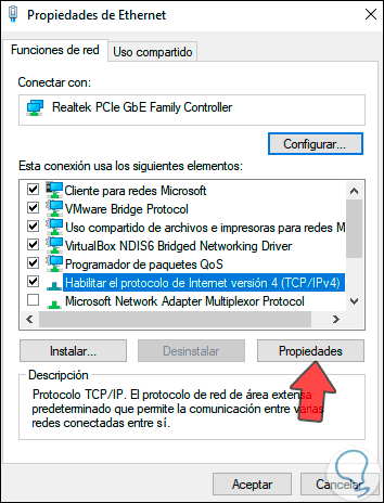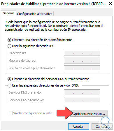 Será desplegada la siguiente ventana. Seleccionamos el “Protocolo de Internet versión 4" y damos clic en "Propiedades", veremos esto: