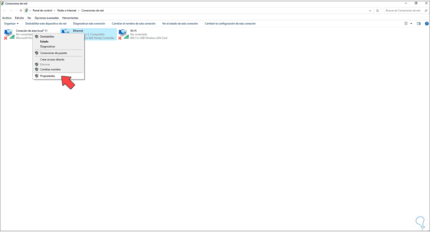 Ahora damos clic en "Cambiar la configuración del adaptador" y después damos clic derecho sobre el adaptador de red y seleccionamos "Propiedades":