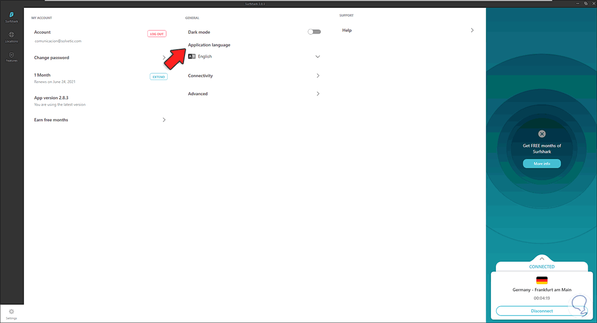 En la parte inferior accedemos a la configuración de la VPN Surfshark. Cambiamos el idioma en primer lugar: