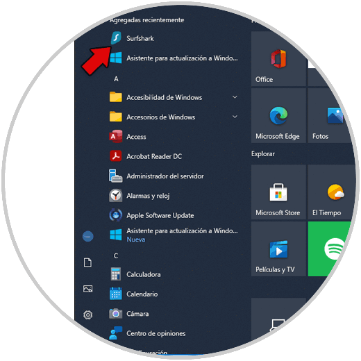 Una vez instalado, abrimos Surfshark desde Inicio: