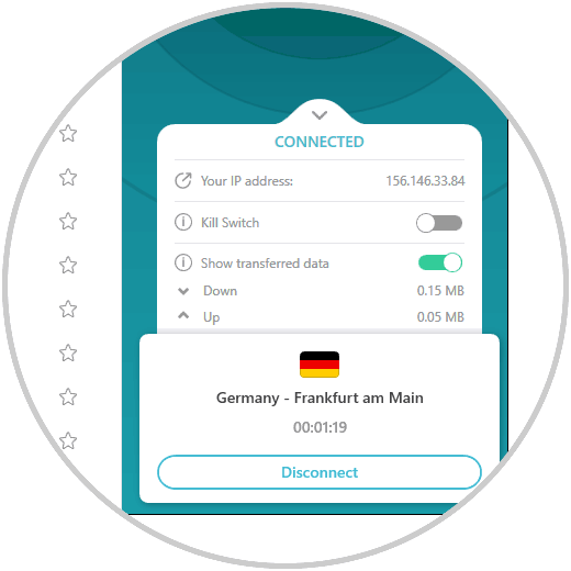 Una vez conectados veremos en el costado derecho el tiempo de uso y el país que hemos seleccionado: