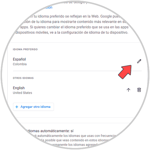 Allí validamos que estemos en el idioma correcto, en este caso español, si se requiere cambiar el idioma o agregar uno adicional, damos clic en el ícono de lápiz y luego seleccionamos el idioma a añadir.