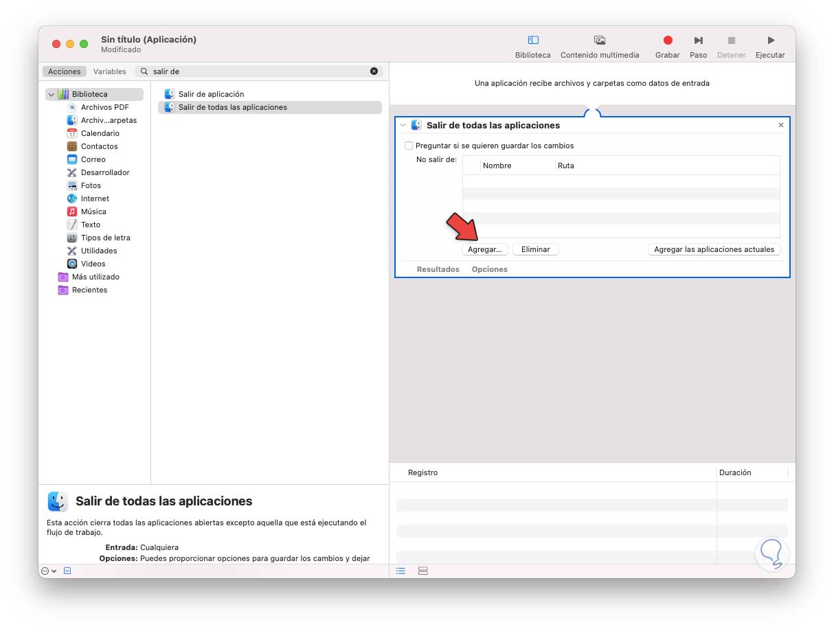 Seleccionamos "Salir de todas las aplicaciones" y la arrastramos al panel derecho de Automator:
