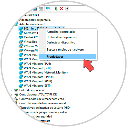 Para ver de qué te hablamos, accedemos al Administrador de dispositivos desde Inicio, vamos a la sección "Adaptadores de red", damos clic derecho sobre el adaptador Wi-Fi y seleccionamos Propiedades: