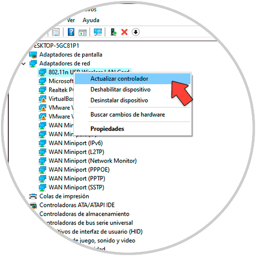 En la ventana del Administrador de dispositivos, vamos a la sección "Adaptadores de red" y damos clic derecho sobre el adaptador Wi-Fi, seleccionamos "Actualizar controlador":