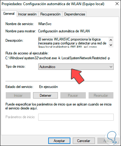 En la ventana emergente validamos que su estado sea automático y que esté en ejecución. Aplica los cambios.