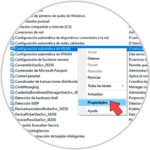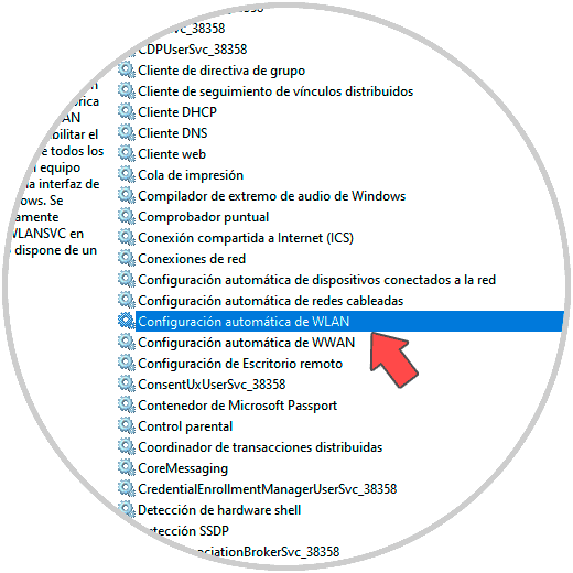 Abrimos los servicios locales, en la ventana de servicios de Windows 10 ubicamos el servicio "Configuración automática de WLAN":
