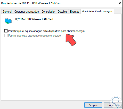 Por defecto Windows 10 puede apagar el adaptador de red para ahorrar energía, pero si esto pasa simplemente será imposible conectarnos a alguna red ya que estaría deshabilitado el adaptador, para descartar que esta sea la causa del error, desactivaremos la casilla "Permitir que el equipo apague este dispositivo para ahorrar energía":