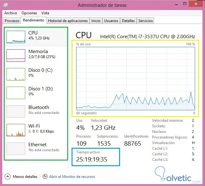 En la siguiente imagen podemos ver ciertos parámetros de nuestro interés como la memoria en uso o el uso del CPU esto marcado con un recuadro verde, además de un gráfico que nos demuestra el comportamiento del mismo en un período de tiempo marcado con un recuadro amarillo: