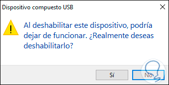 Aplica los cambios dando clic en Si, el dispositivo USB estará desactivado: