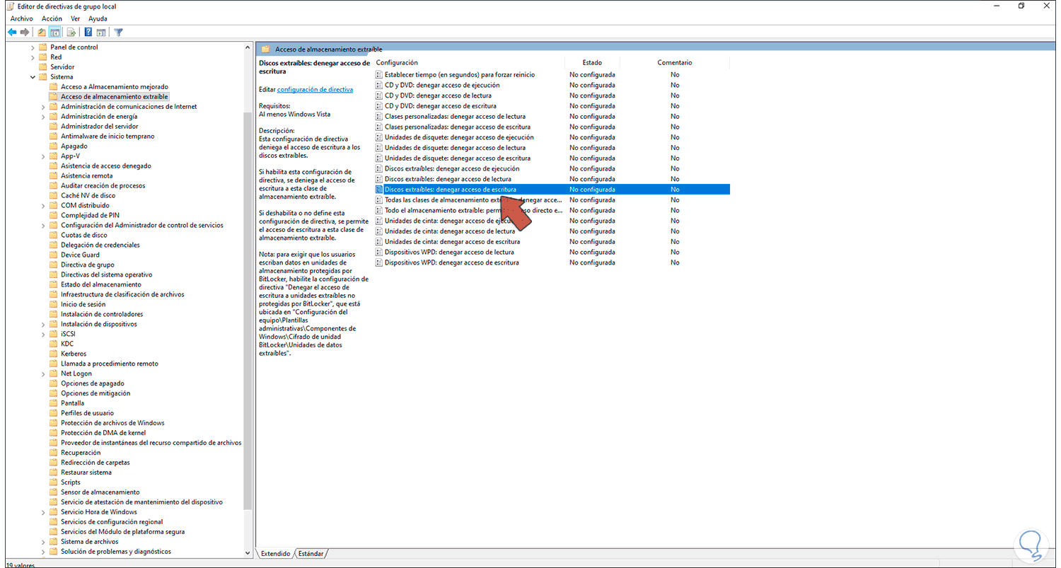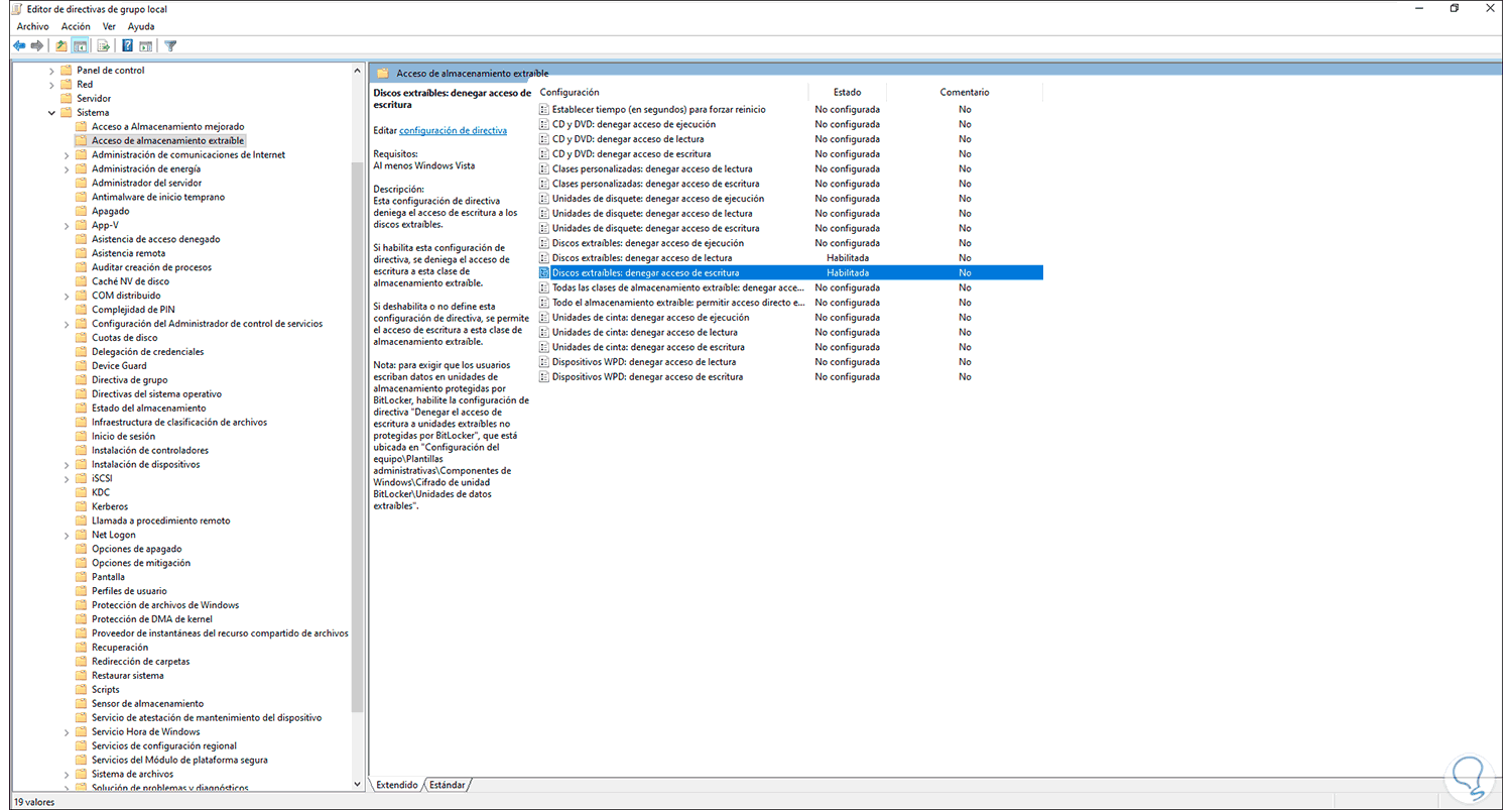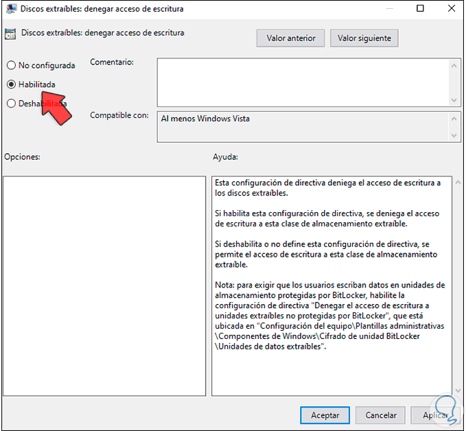 Aplicamos los cambios, ahora editamos la política “Discos extraíbles: denegar acceso de escritura” y activamos la casilla “Habilitada”: