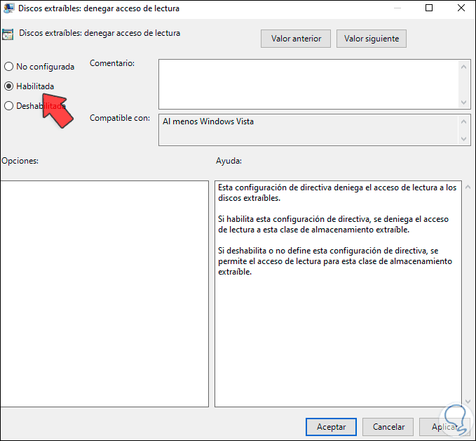 Editamos la política “Discos extraíbles: denegar acceso de lectura” y activamos la casilla Habilitada: