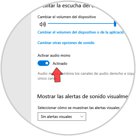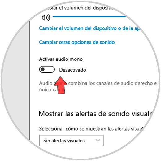 En la ventana de configuración que se abre, veremos lo siguiente. Pulsamos en el interruptor "Activar audio mono" para desactivarlo